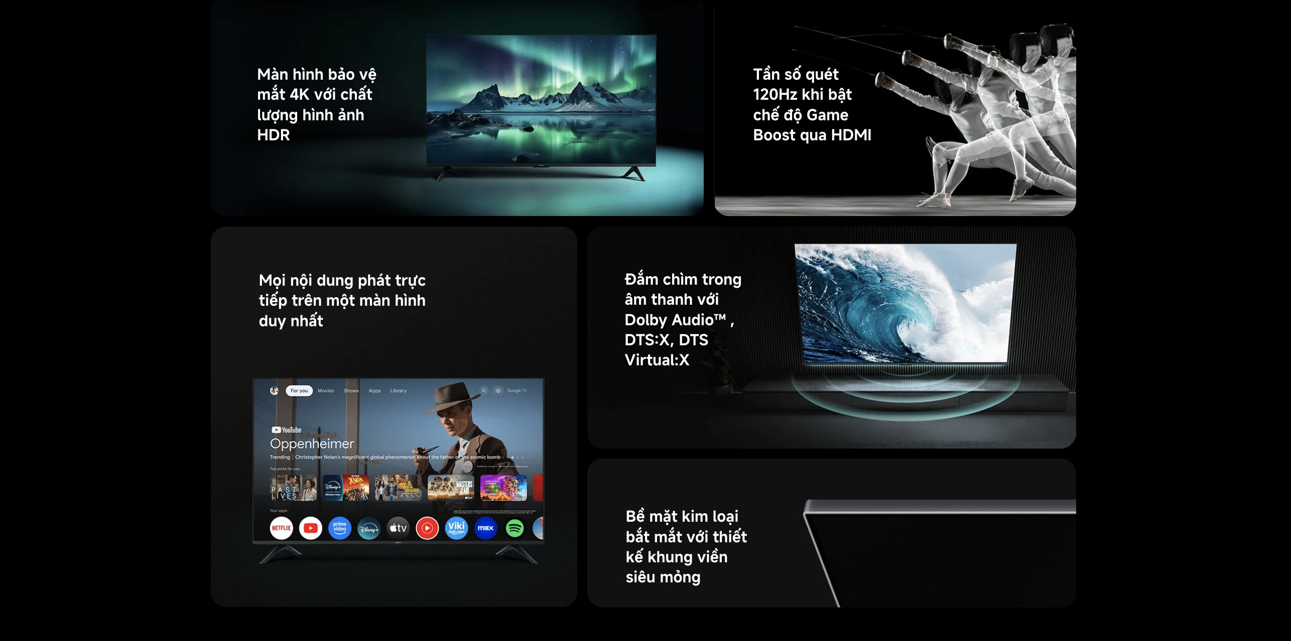 Tivi Xiaomi A 55 inch đạt chuẩn độ phân giải 4K Ultra HD, cho hình ảnh siêu rõ nét, ngay cả với những chi tiết nhỏ nhất. Thưởng thức phim, game hay thể thao đều đạt chất lượng cao.