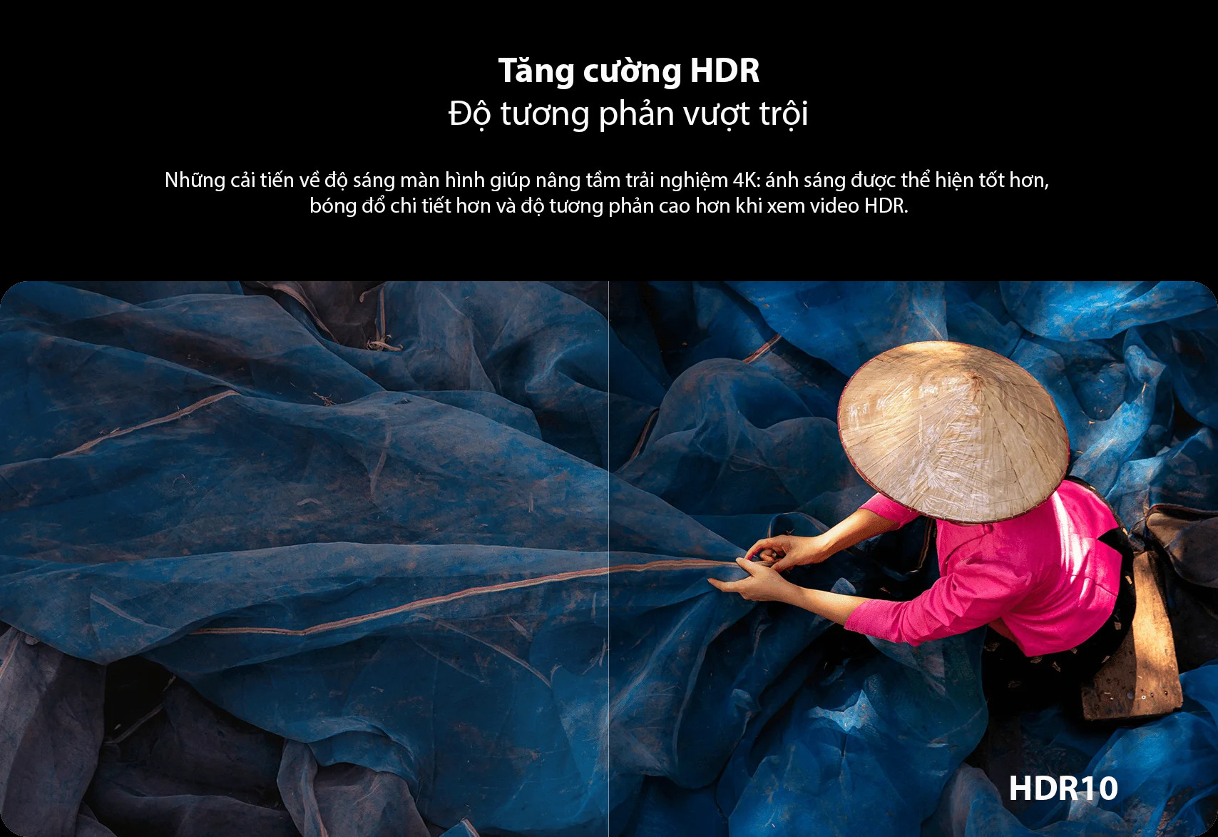 Hỗ trợ HDR giúp tăng độ sáng và độ tương phản cho hình ảnh, hiển thị rõ ràng hơn cả vùng sáng lẫn vùng tối, mang lại chiều sâu và cảm giác sống động hơn cho từng cảnh quay.