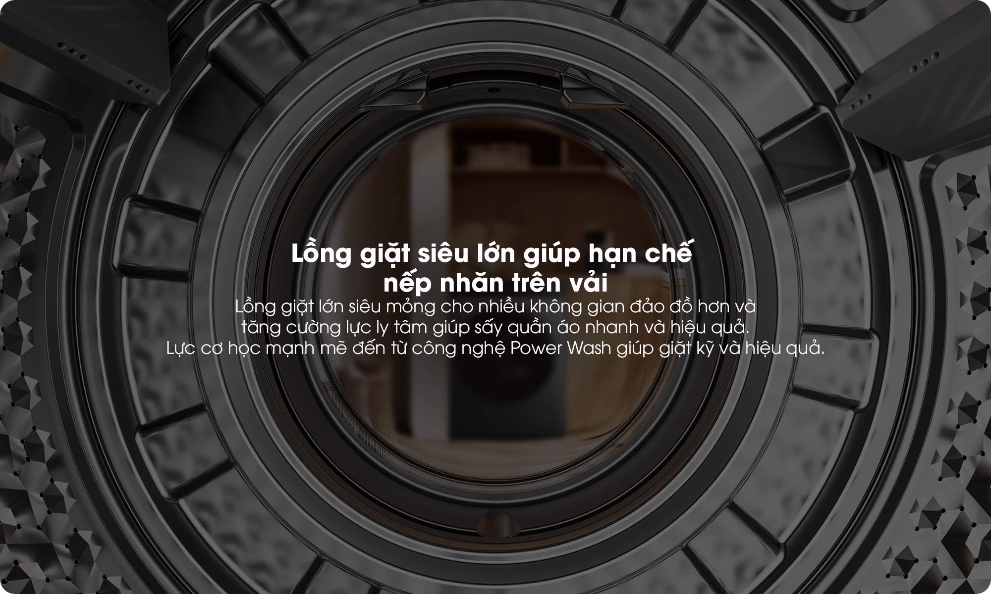 Giặt sấy 2 trong 1: Với chế độ Wash & Dry (Giặt sấy) chỉ trong 59 phút, kết hợp tốc độ gió lên đến 14,5 m/giây giúp quần áo được giặt sạch và sấy khô nhanh chóng. Tính năng này mang đến trải nghiệm giặt giũ dễ dàng, tiết kiệm thời gian cho mọi gia đình.